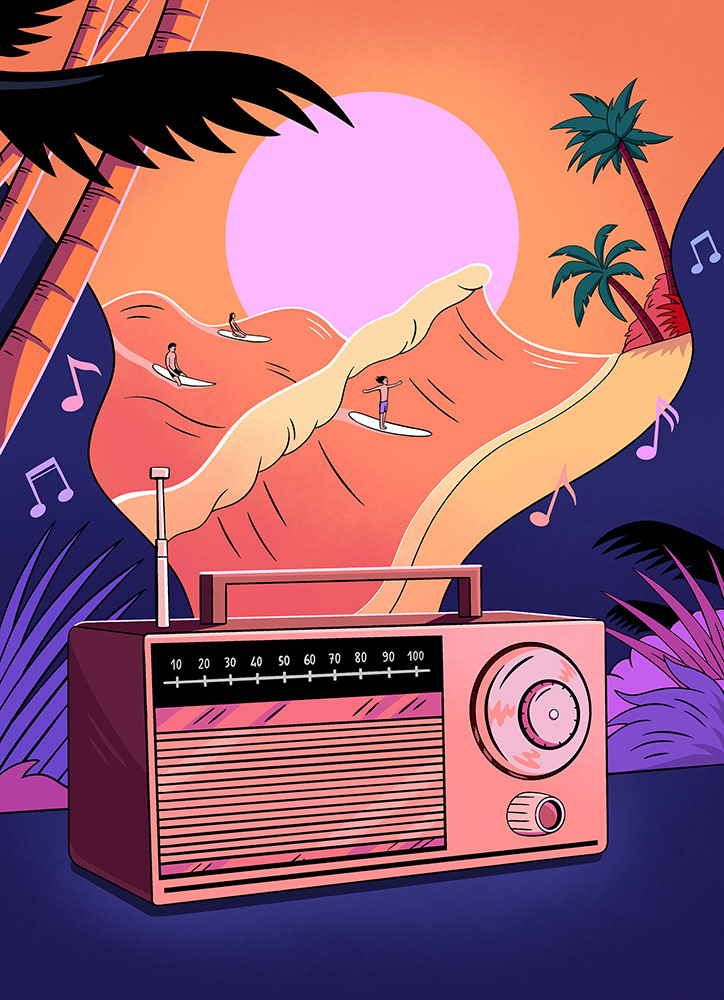 Commissioned editorial illustrations for an article about californian surf and beach boys music in the 70's.